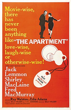ビリー・ワイルダーの代表作ともいえるシチュエーションコメディ。10年温めたアイデアで、時代の流れにあわせてようやく映像化にこぎ着けた。出世と上司へのゴマスリのため、自分のアパートを愛人との密会場所として重役に提供するバクスター。お調子者の彼は出世街道に乗り意気揚々とするが、思いを寄せていたエレベーターガールまでもがアパートを出入りするひとりと知り、愕然とする。ワイルダーはこの作品で念願のアカデミー監督賞を手にした。